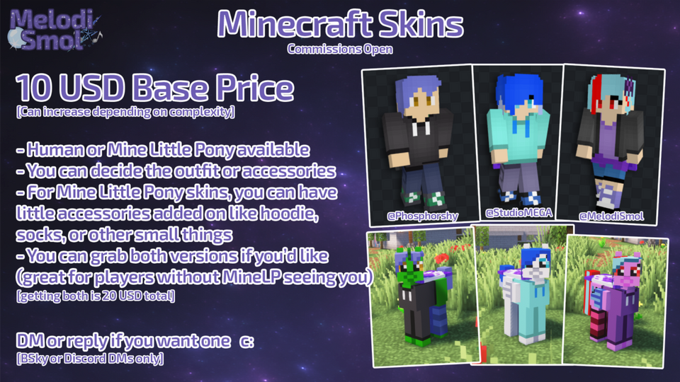 These are kinda self-explanatory, I'll make your OC into the Minecraft style either as human and/or with the Mine Little Pony mod. Complex OCs may not be possible for this comm option due to the pixel-art style I work with for these skins.Be sure to check my Terms of Service for info and my refund policy.