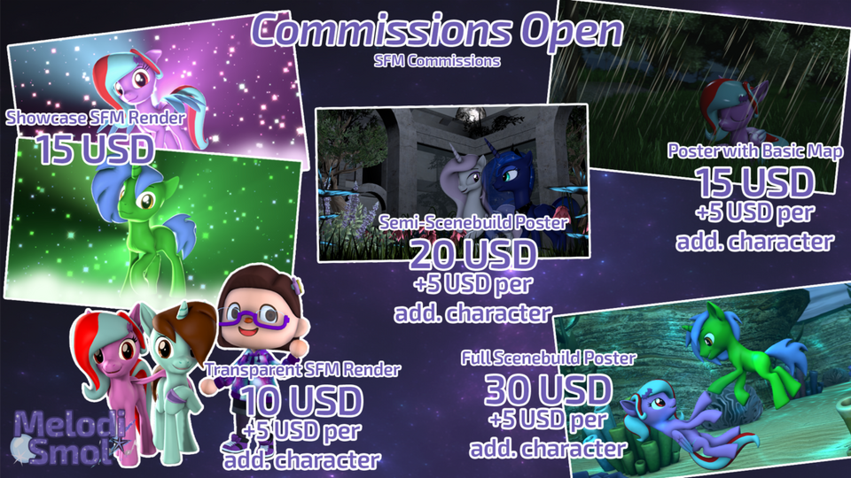 I have commissions available if you'd like to get some artwork from me. I can do MLP or Animal Crossing artwork, but for MLP, if you want your OC in a poster, you must have a model already made for me to use as I can't make models myself. Animal Crossing isn't much of a problem because all the clothing is readily available for me to use for your character of choice, but I'm not that good with posing humanoid bodies, so be warned.Be sure to check my Terms of Service for info and my refund policy.