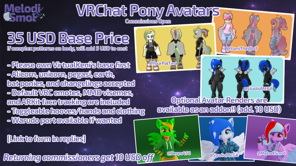 Commissions are also available for VRChat pony avatars, which are made using a base by VirtualKeni and SFM resources that are available. I can do alicorn, unicorn, pegasi, earth ponies, changelings, and bat ponies, with various toggles like hooves to hands (and vice versa) and some clothing parts (hoodie, socks, shorts, arm warmers). There is also toggles to let your OC swap between other pony parts (excluding changelings and bat ponies due to the way the wings are set up), so if you have a pegasus OC and suddenly want them to become an alicorn, that would be possible. The avatars come with default basic VRC emotes built into GoGo Loco, MMD visemes for those dance worlds, ARKit face tracking, various eye and mouth expression toggles, as well as some hand gestures that Keni originally set up for the base, to allow for cute expressions for photos.I can also do canon ponies in my style of pony avatar as well for the same price, and there would be no need to own the base prior as canon ponies by default will be public avatars.Warudo ports are also available at a small extra cost for use in streaming, except when commissioning a canon character, those will not be ported.Click the button below to be taken to my contact form to grab a VRC commission c:[TL;DR VRChat pony comms available for OCs or canon ponies (own the base for OCs), they come with cool features, and perfect for streaming]Be sure to check my Terms of Service for info and my refund policy.
