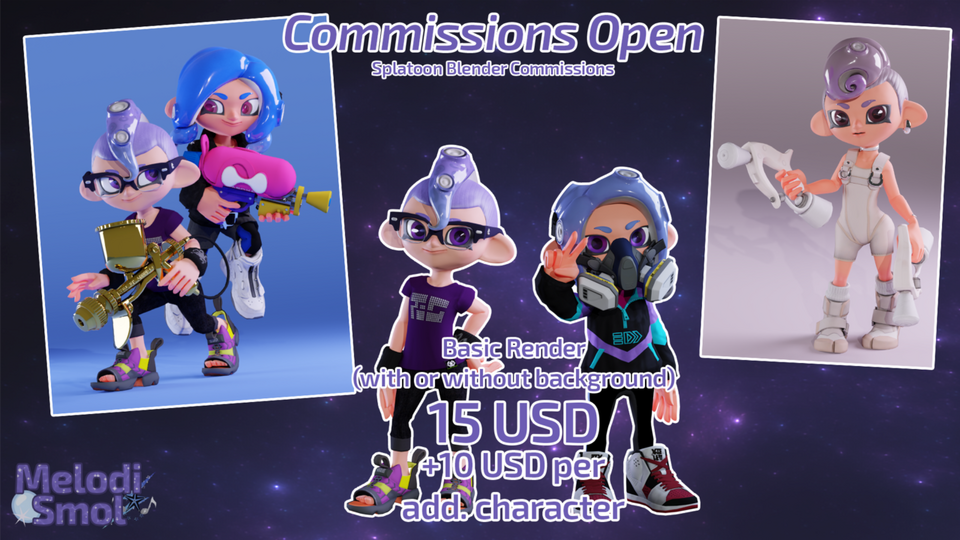 Simple renders for Splatoon OCs are available for comms, I have access to all of Splatoon 3's current gear options, including Alterna and Side Order gear. Transparent and simple colour backgrounds are the only options for now until I can get better with working with background scenes or using Splatoon maps that have been ported to Blender.Be sure to check my Terms of Service for info and my refund policy.