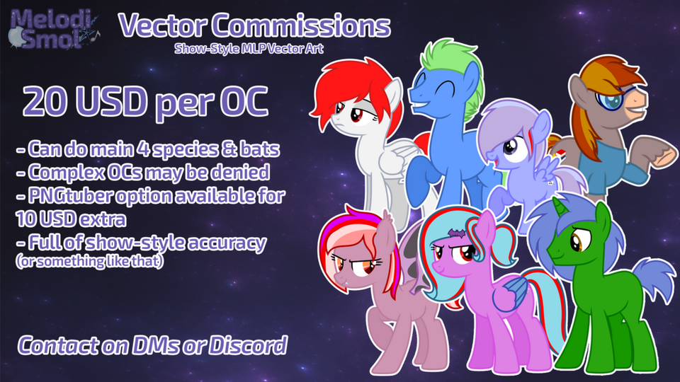Ever wondered what your pony OC would look like in the MLP:FiM show style? I can try my best to provide that with these vector comms. Unfortunately due to limitations I can't do complex OCs or any species other than ponies.Be sure to check my Terms of Service for info and my refund policy.