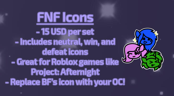 The other form of 2D art comms I do are Friday Night Funkin icons, since they're pretty simple to replicate and work with. Full sets all come with neutral, win, and defeat icons, with the expressions being chosen by yourself. These icons are usually pretty great for use in Roblox games like Project: Afternight (AFN requires 50 unique FCs to unlock custom icons).Be sure to check my Terms of Service for info and my refund policy.